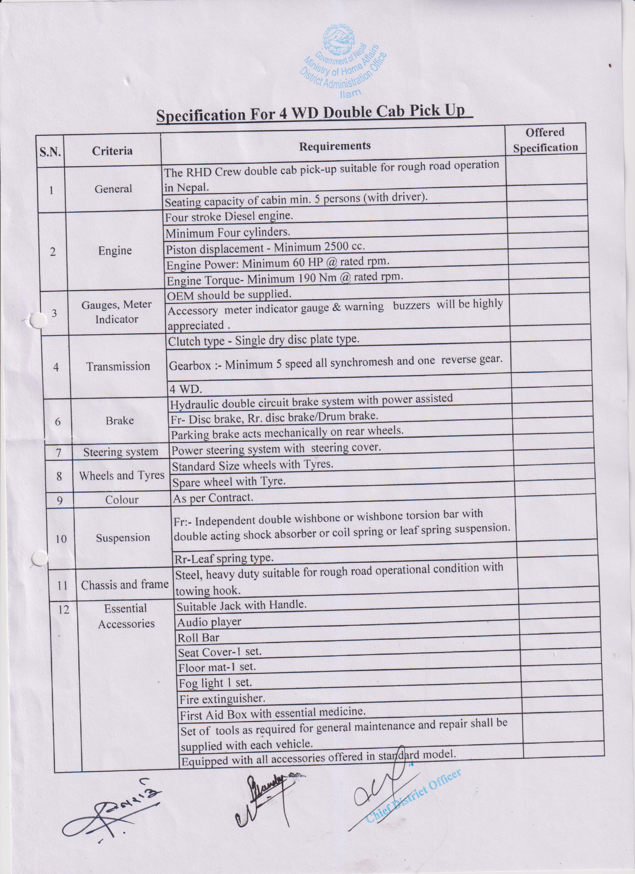 4 WD डबल क्याब पिकअपको स्पेसिफिकेसन र लागत अनुमान