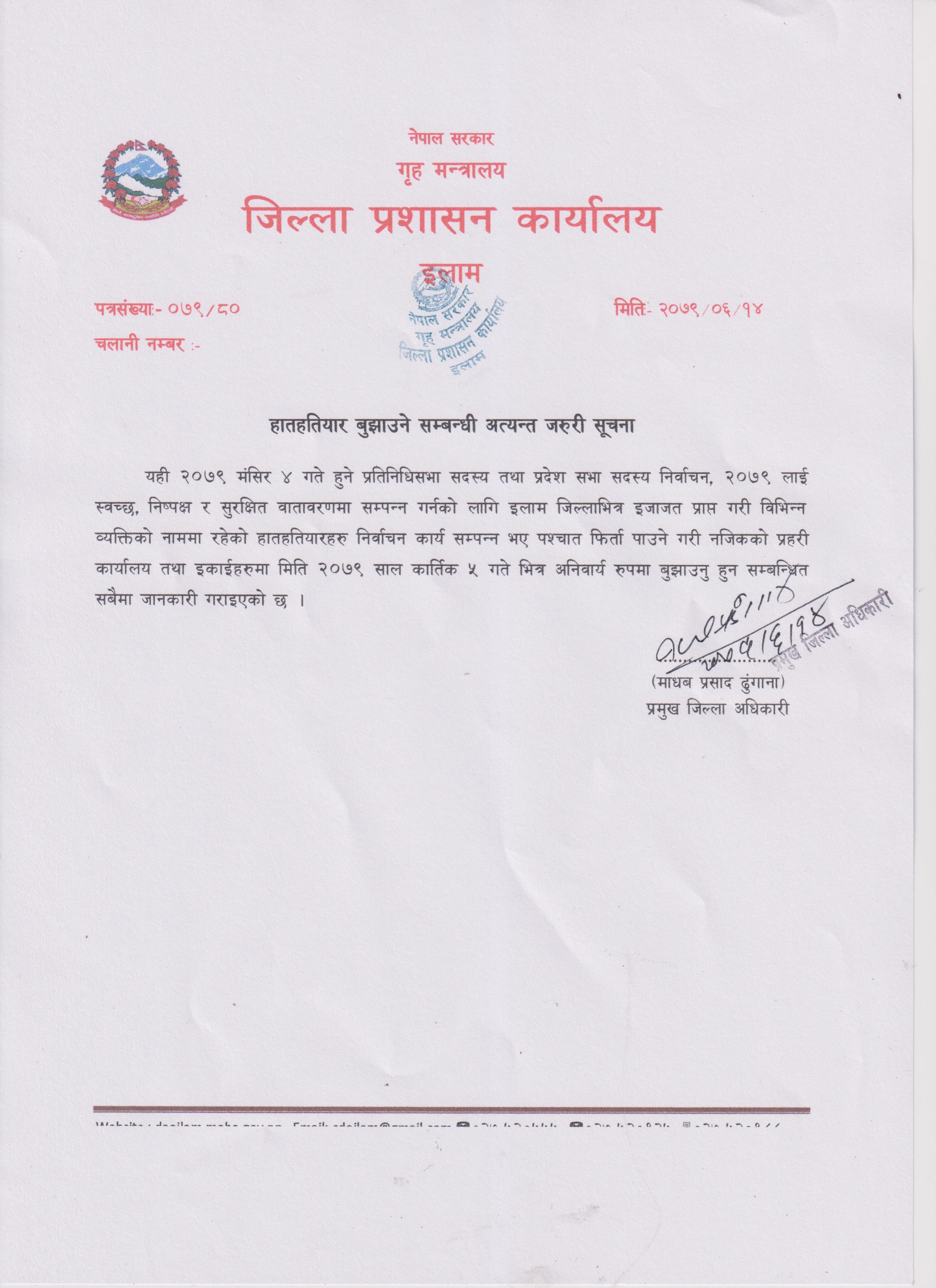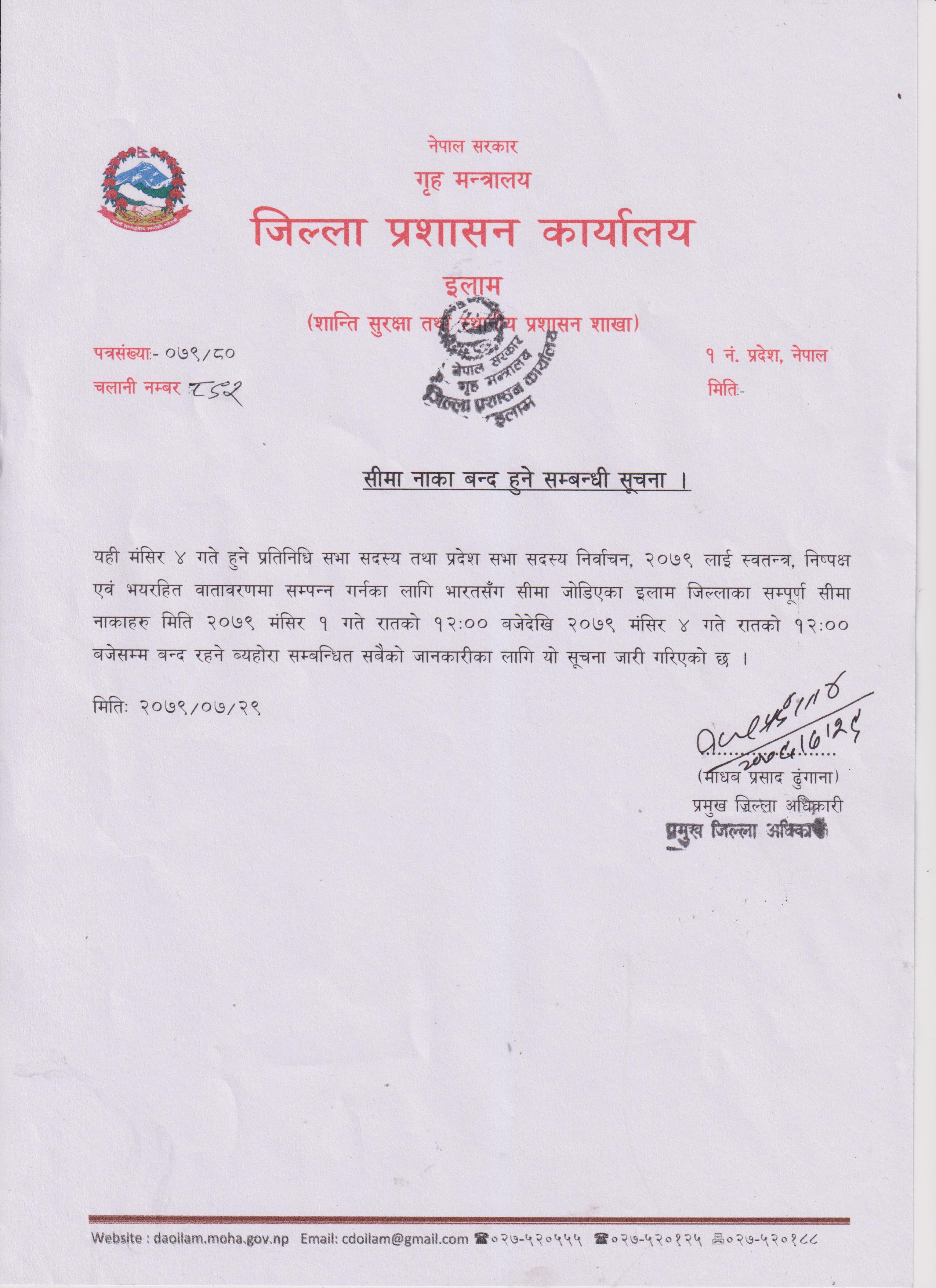 जिल्ला प्रशासन कार्यालय इलामबाट जारी आदेश