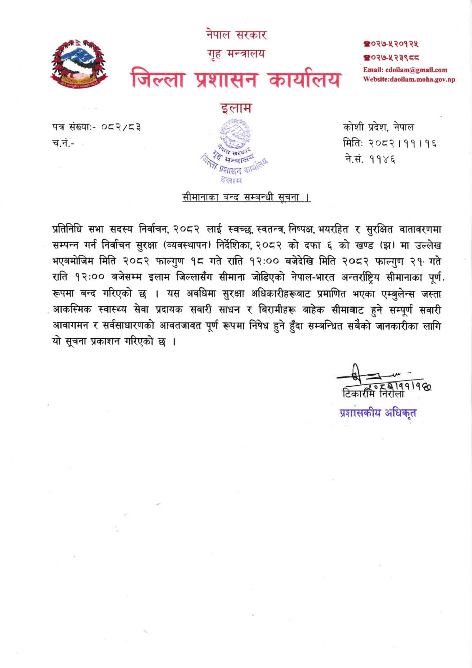© सर्वाधिकार सुरक्षित जिल्ला प्रशासन कार्यालय, इलाम