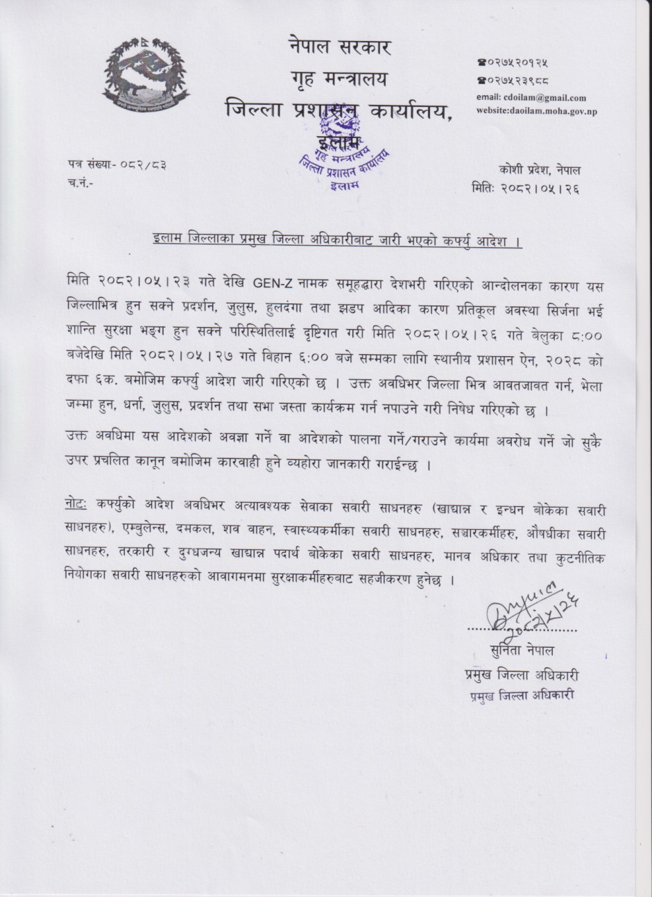प्रमुख जिल्ला अधिकारीबाट जारी भएको कर्फ्यु आदेश