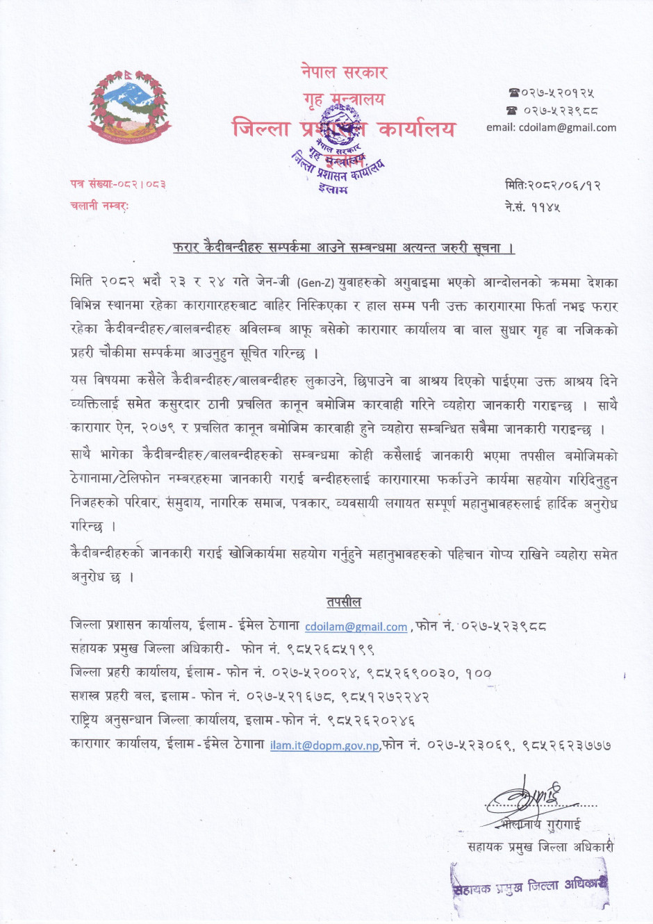 फरार कैदीबन्दी सम्पर्कमा आउने सम्बन्धी अत्यन्तै जरुरी सूचना ।