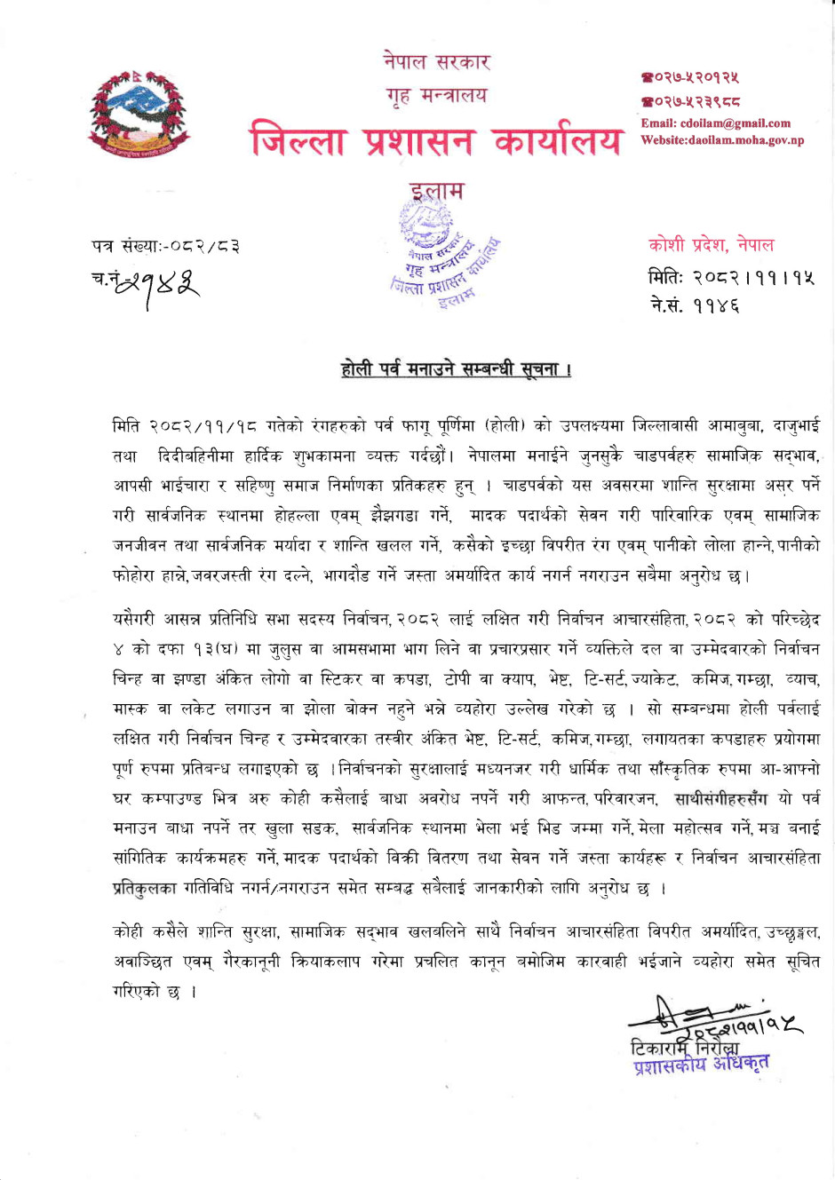 होली पर्व मनाउने सम्बन्धी सूचना !