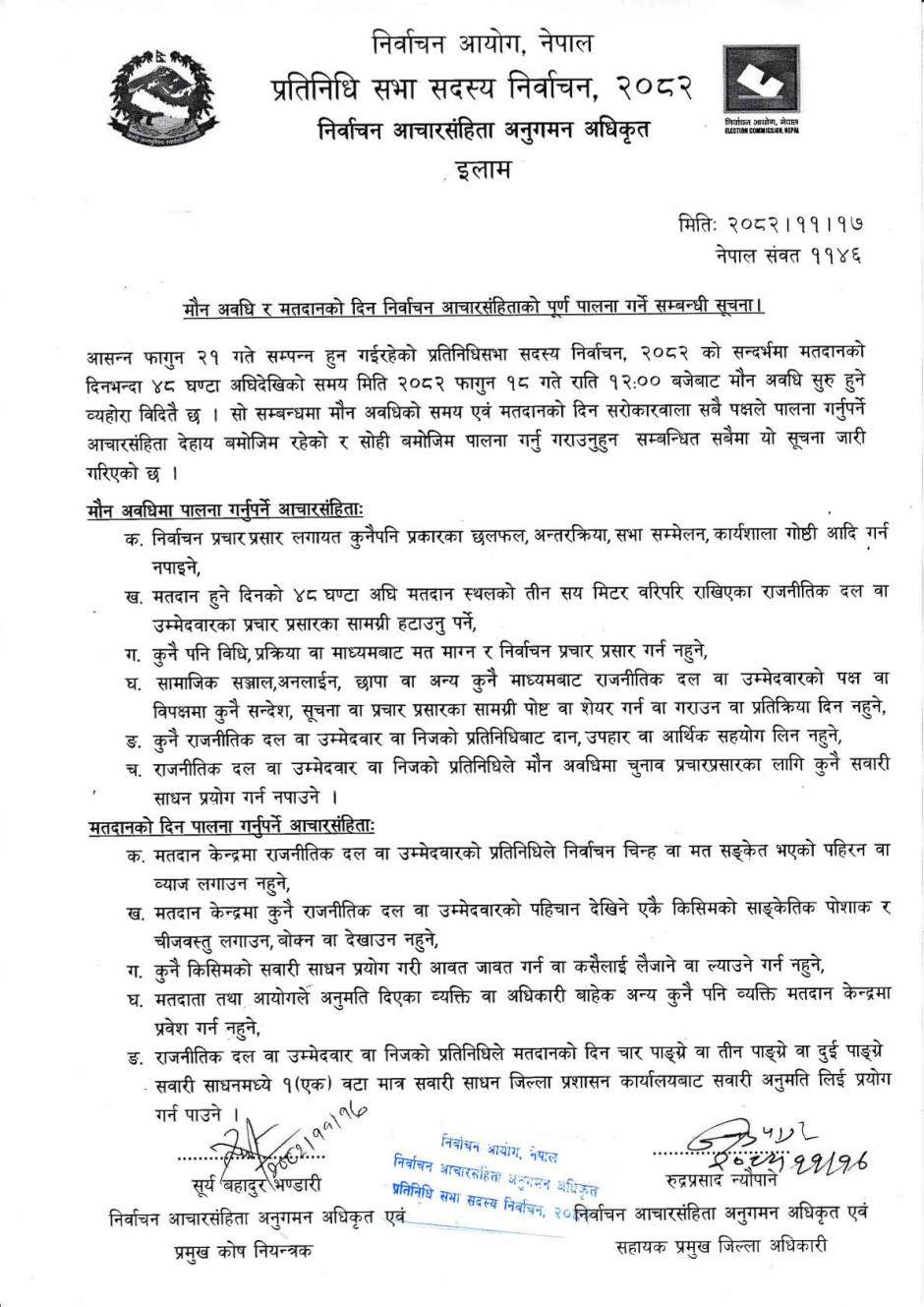 मौन अवधि र मतदानको दिन निर्वाचन आचारसंहिताको पूर्ण पालना गर्ने सम्बन्धी सूचना।