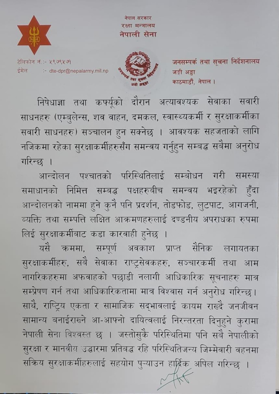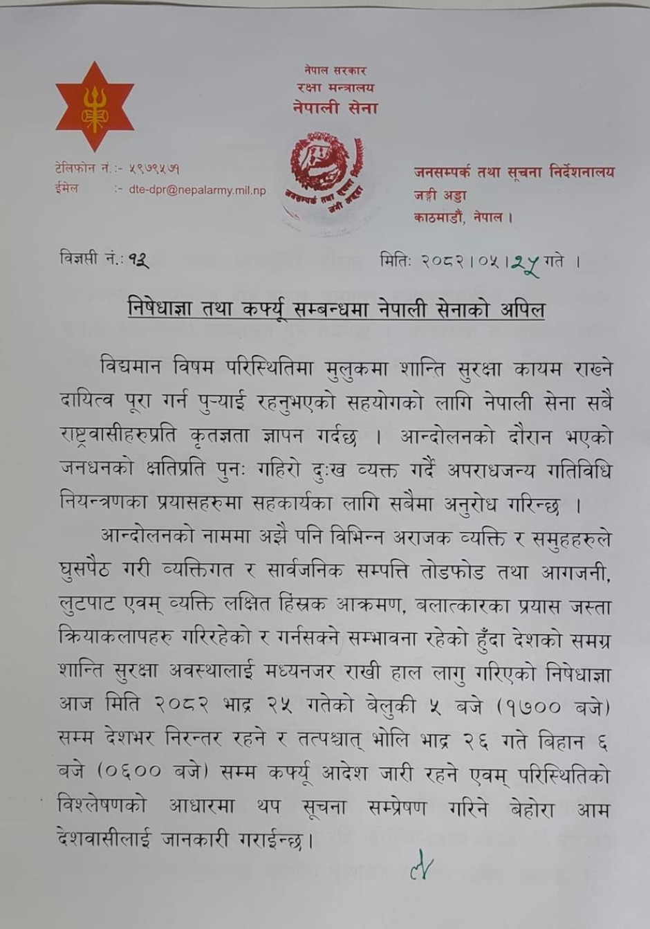 निषेधाज्ञा तथा कर्फ्यु सम्बन्धमा नेपाली सेनाको अपिल