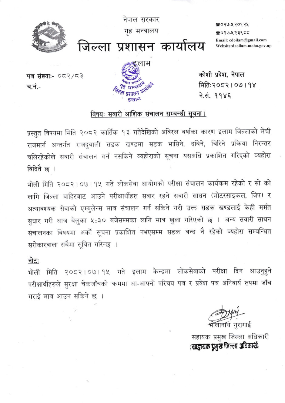 सवारी आवागमन बन्द सम्बन्धी सूचना