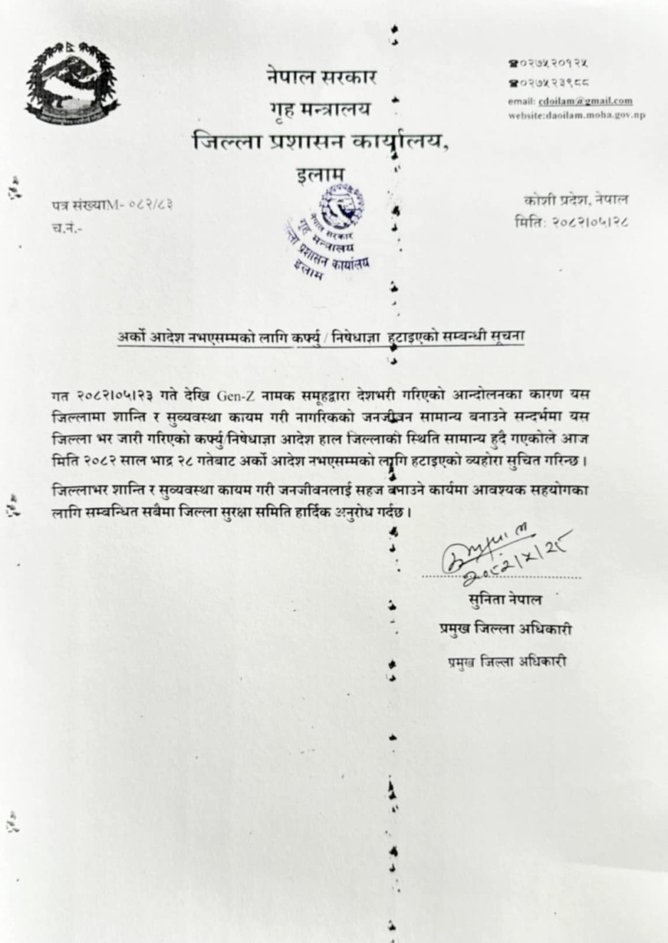 कर्फ्यू/निषेधाज्ञा हटाइएको सम्बन्धी सूचना