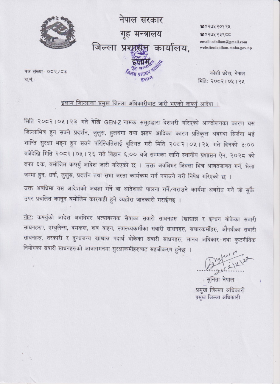 प्रमुख जिल्ला अधिकारीबाट जारी भएको कर्फ्यु आदेश ।