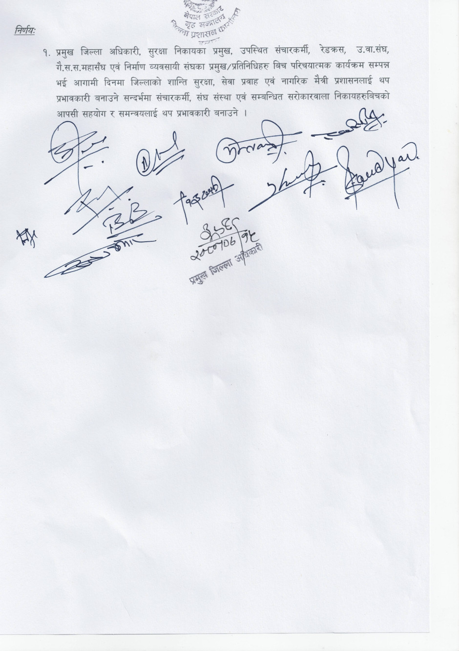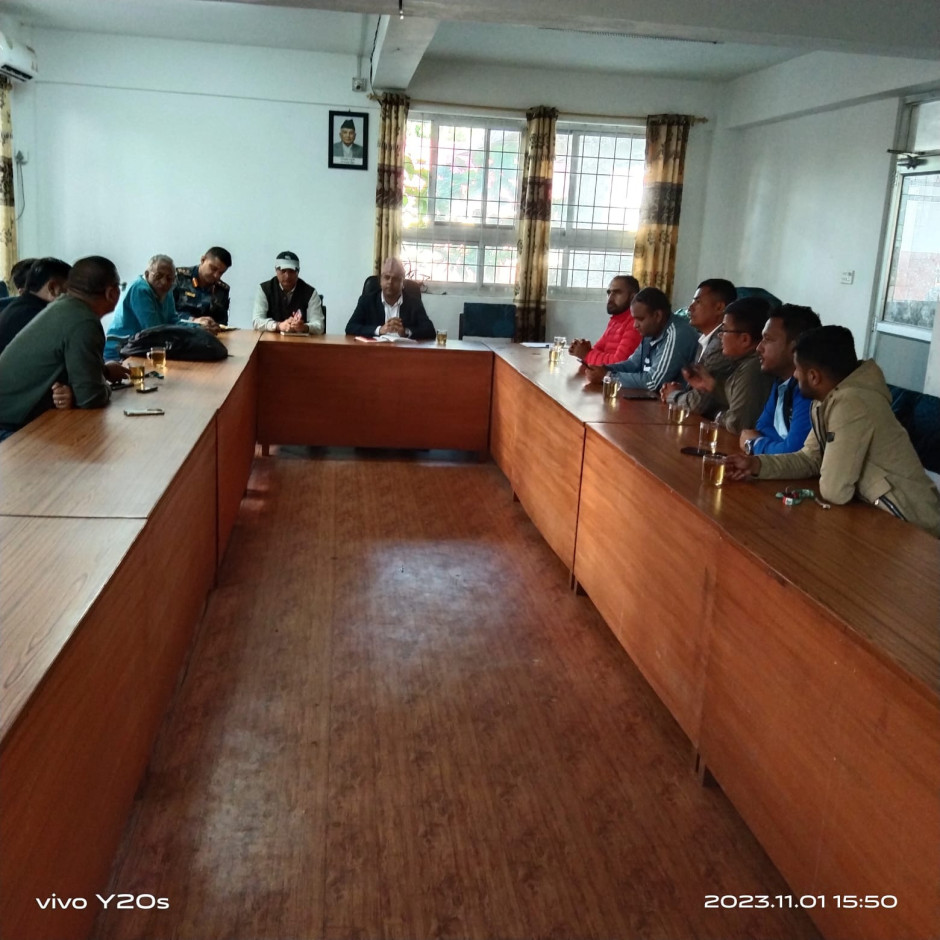प्रमुख जिल्ला अधिकारीको अध्यक्षतामा जिल्ला स्थित सुरक्षा निकायका प्रमुख, उपस्थित संचारकर्मी, रेडक्रस, उ.वा.संघ, गै.स.स.महासँघ एवं निर्माण व्यवसायी संघका प्रमुख/प्रतिनिधिहरु बिच परिचयात्मक एवं समन्वय बैठक ।