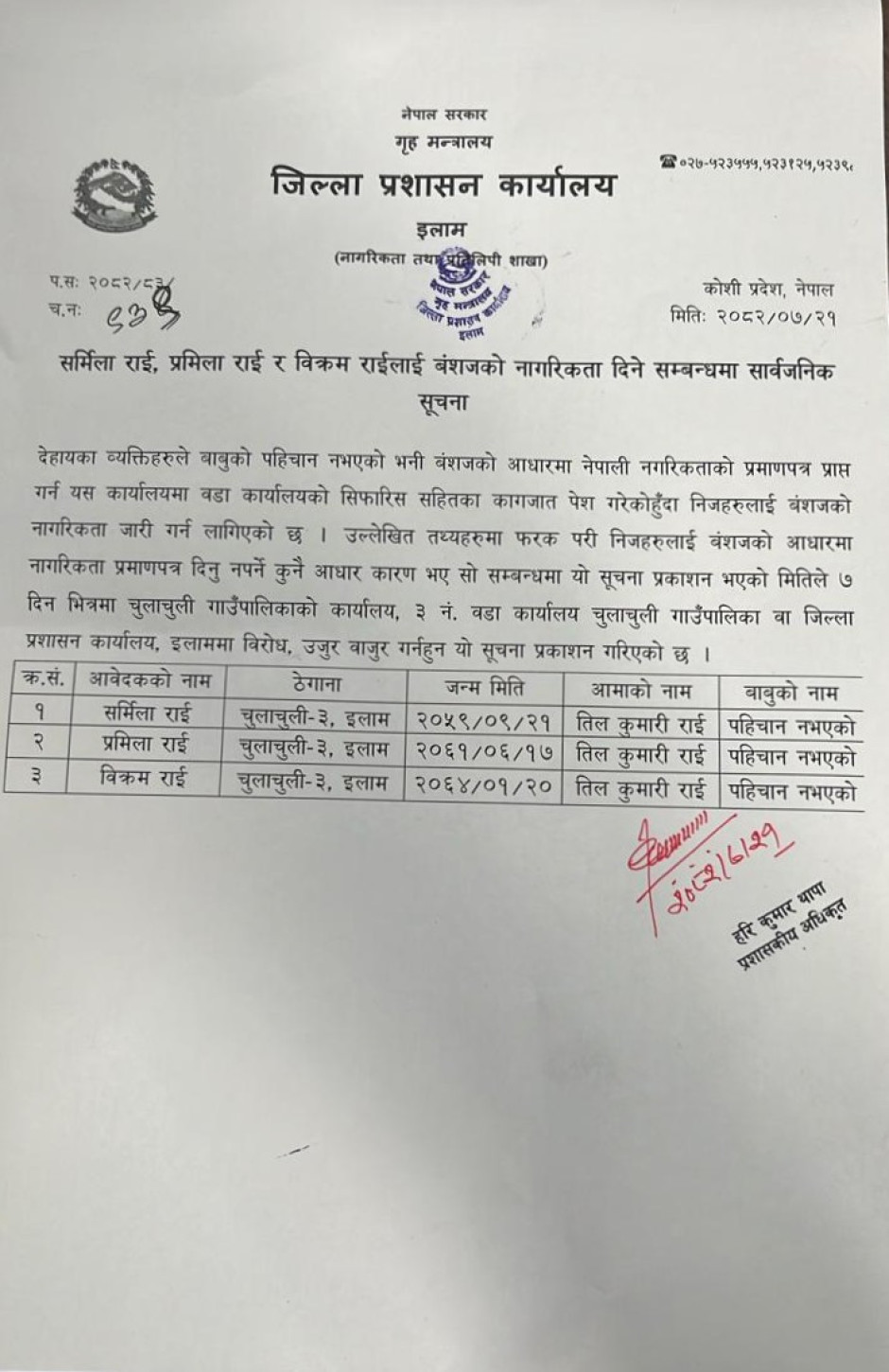 नागरिकता दिने सम्बन्धमा सार्वजनिक सूचना