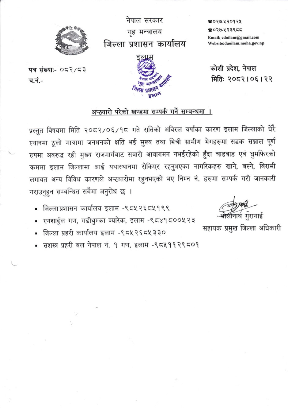 अप्ठ्यारो परेको खण्डमा सम्पर्क गर्ने सम्बन्धमा