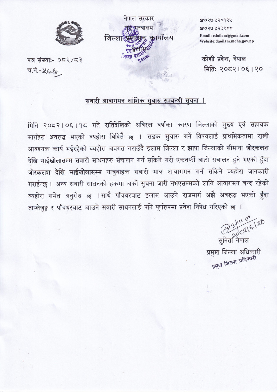 सवारी आवागमन आंशिक सूचारु सम्बन्धी सूचना ।